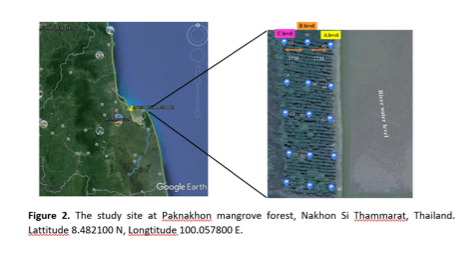 The study site was located at Paknakhon mangrove forest, Nakhon Si Thammarat, southern Thailand. Lattitude 8.482100 N, Longtitude 100.057800 E (Figure 2).
