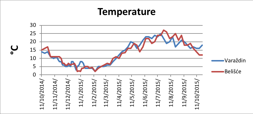 In Chart 2, it is seen that water temperature at both stations match. The temperature maxima were recorded in July and August (Belisce - 27˚C, and Varazdin - 25 ° C). Minimum temperature was recorded in December and February.