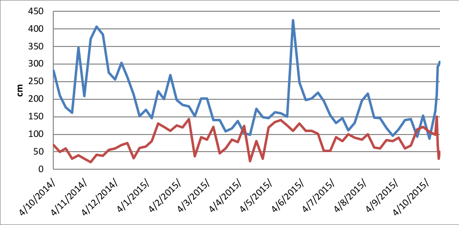 Chart 4. Graphic view of impact of water levels (Blue line) on transparency (Red line) at the station