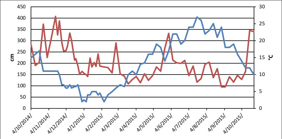Chart 7. The dynamics of the water level (red line) and water temperature (blue line) at station Belisce.