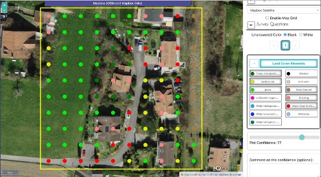 An example of Collect Earth Online labels I completed for one of my locations. Each dot in the grid can be assigned a label depending on what category of land cover is underneath it. The category options can be seen on the right.