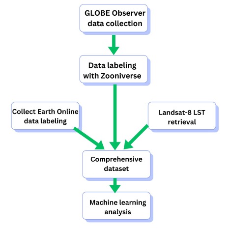 Of course, experts have been modeling surface temperatures for years, so I was initially unsure how our group of eight high school interns would contribute anything to the field. However, with Peder’s guidance, I realized that the dataset of GLOBE photos collected by SEES interns had yet to be explored in any scientific context. We set out to study how (and if!) citizen-collected data could increase the accuracies of predictive models for surface temperature. Specifically, we wanted to see if land cover data from GLOBE Observer “down” photos correlated to surface temperatures within a region. (Concrete surfaces would most likely be hotter, for instance, while areas with grass or water would be cooler.)