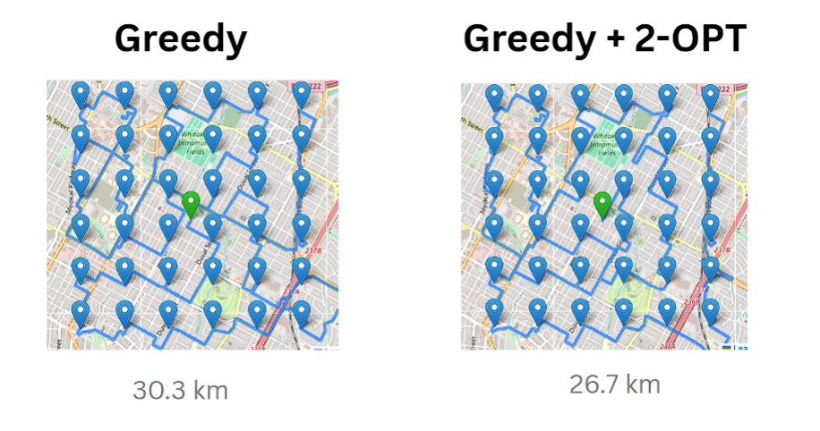 For this AOI, Greedy alone gave me a total drive of around 30.3 km. After running 2-Opt, that dropped to 26.7 km. That’s a 11.9% reduction!