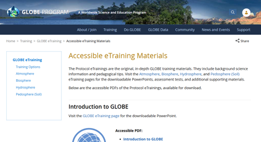 Following the release of the new GLOBE Data Collection eTrainings, we are excited to announce that the original, in-depth GLOBE Protocol eTraining PowerPoints now have accessible PDF versions available for download. Protocol eTrainings from Atmosphere, Biosphere, Hydrosphere, Pedosphere, and Introduction to GLOBE now offer these new, easy-to-use PDFs as an optional resource, providing an alternative option for users who prefer PDF over PowerPoint, use screen readers, text-to-speech programs, braille displays, and more.